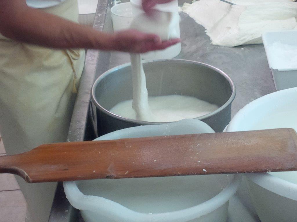 Käserei: Der Mozzarella wird von Hand gezogen. Mozzarella sollte immer möglichst frisch gegessen werden, daher stehen die Cilentani Schlange, sobald der Mozzarella fertig zum Verkauf ist.